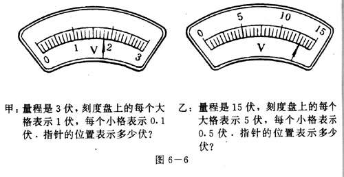 电压表的示数电压表的刻度盘上标有符号V和表示电压值的刻度.电压表也有一定的量程.在读取数据时,要先确认所用电压表的量程,然后根据量程确认刻度盘上每个大格和每个小格表示的电压值(图6-6).学校实验室里常用的电压差有三个接钱柱、两个量程(图6-7).