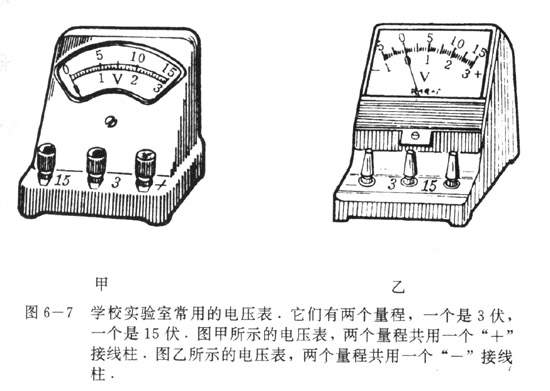 侧是电路两端的电压,要用电压表.电压表也有很多种,图6-5给出了几种电压表的外形,图中左上角是电压表在电路图中的符号.